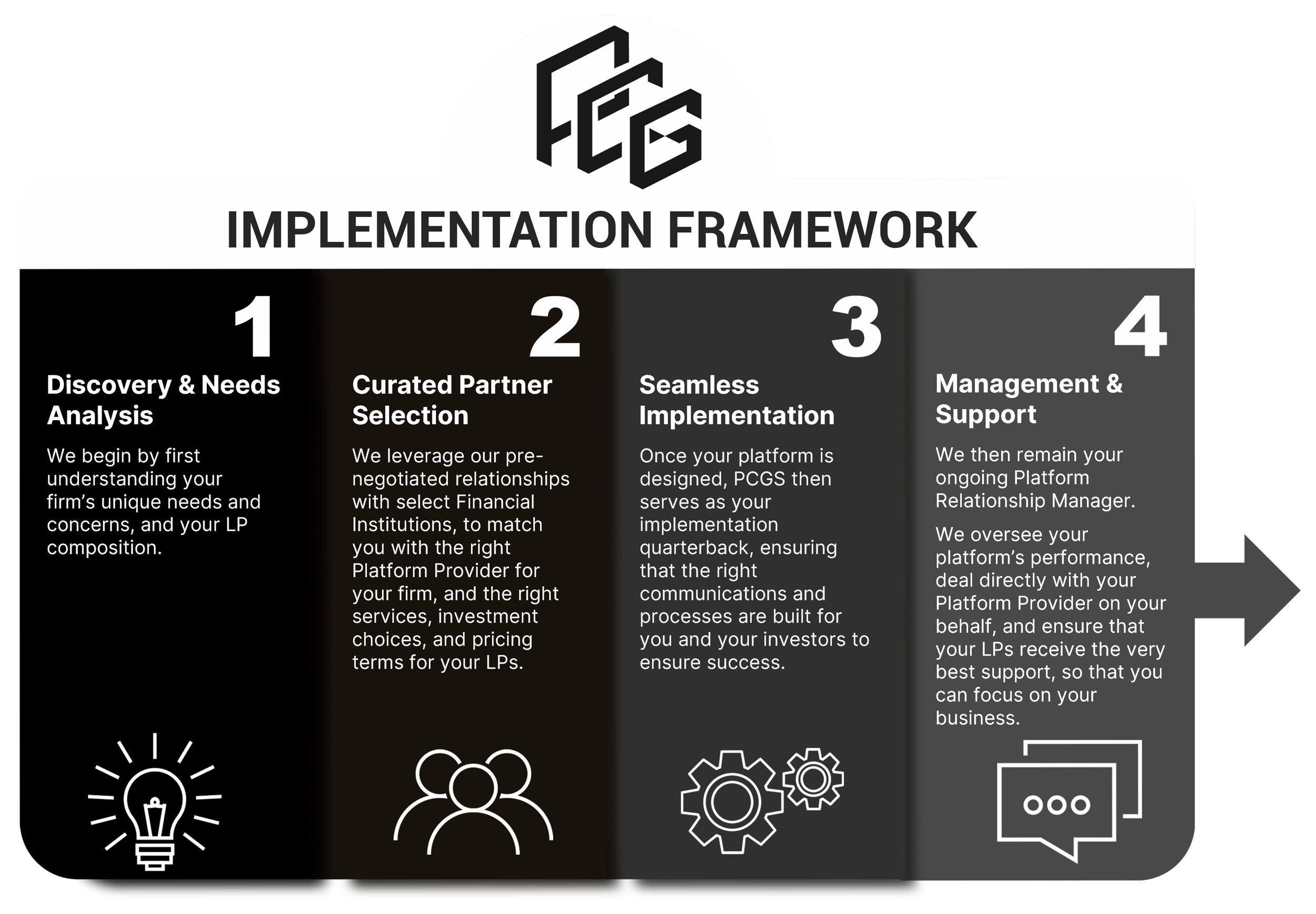 PCGS manages all aspects of the design and selection process for your Platform Provider, and your Investment choices, negotiates the terms and fees on your behalf, coordinates your Platform implementation, and oversees its ongoing success.